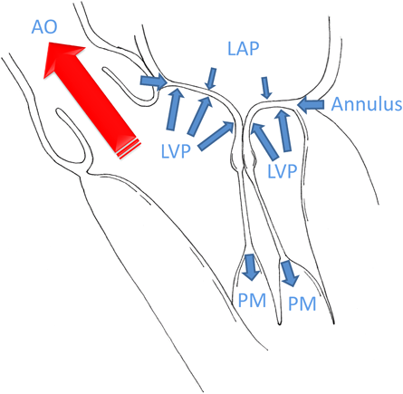 Blue arrows indicate pressure or force working on the atrioventricular valve complex during systole. AO: aorta, LAP: left atrial pressure, LVP: left ventricular pressure, PM: papillary muscle.