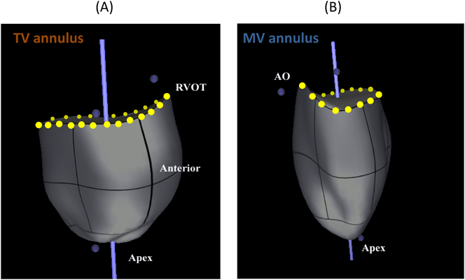 (A) Tricuspid valve annulus: Yellow dots indicate the annulus. Note the saddle shape of the annulus with increased height in the direction of the right ventricular outflow. (B) Mitral valve annulus: Yellow dots indicate the annulus. Note the saddle shape of the annulus with increased height in the direction of the aorta. AO: aorta, MV: mitral valve, RVOT: right ventricular outflow tract, TV: tricuspid valve.