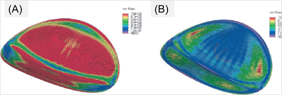 (A) Leaflet stress without leaflet billowing. (B) Leaflet stress with leaflet billowing. Note the significant reduction of leaflet stress by the billowing of the leaflet of the mitral valve. AHCWR was 15% for both cases. Reprinted from Ref. 2) with permission (confirmation number=11576733).