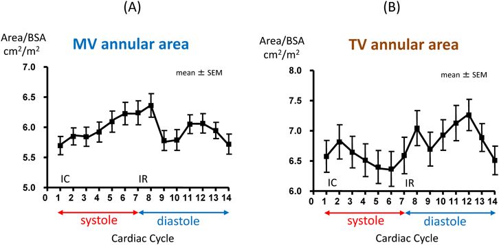 (A) The change of annular area of mitral valve along cardiac cycle. The annular area continuously enlarges during systole and becomes largest at isovolumic relaxation just before mitral valve opening. (B) The change of annular area of the tricuspid valve along the cardiac cycle. The annular area shrinks during systole and becomes largest in late diastole, just before the atrial contraction. BSA, body surface area; IC, isovolumic contraction period; IR, isovolumic relaxation period; MV, mitral valve; SEM, standard error of mean; TV, tricuspid valve. Modified from Ref. 1).