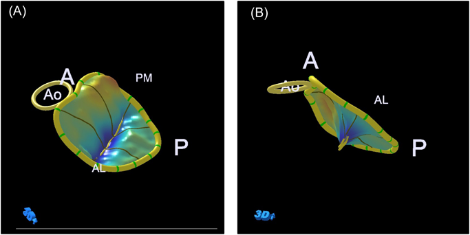 (A) Note the mild billowing of anterior leaflet. (B) Note the tenting of mitral valve. A: anterior, AL: anterolateral, AO: aorta, P: posterior, PM; posteromedial.