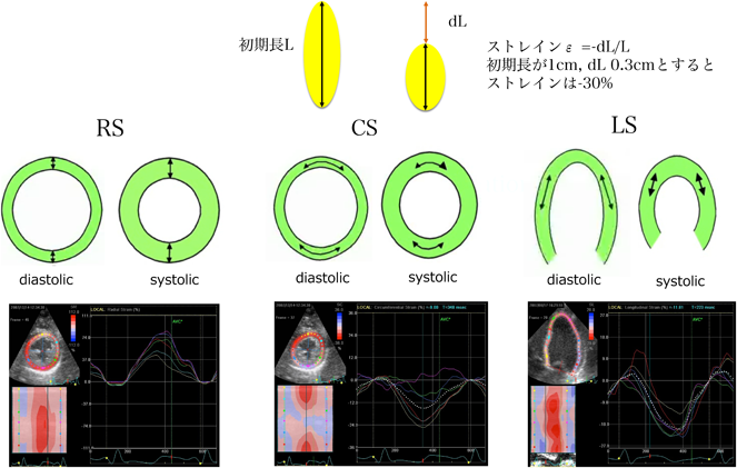 ストレイン法による評価は心筋壁の複雑な収縮様式を3方向のいずれかに分けて心室壁短縮と壁厚増加として観察しているため,心筋線維方向,心筋シートの基本構造をもとに考えると,長軸方向:LSのストレイン計測は,主に内側の心筋の短縮を,円周方向:CSのストレインは中層の心筋の短縮を,短軸方向:RSのストレインは内側の壁厚増加を中心に見ていることとなる.