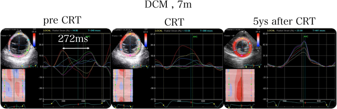 In a DCM patient of 7 months, the difference between time-to-peak septal and posterior RS in the LV was 272 ms. During CRT, the optimal pacing site was located by changing the LV pacing position simultaneously. Echocardiography showed a serial and remarkable improvement of LV contraction, both immediately and 5 years after CRT. Moreover, the LV mechanical dyssynchrony was also recovered in time-to-peak RS curves by STE. CRT: cardiac resynchronizing therapy, DCM: dilated cardiomyopathy, LV: left ventricle, RS: radial strain, STE: speckle tracking echocardiography.