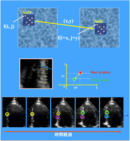 Block matching method: The two-dimensional (2D) positional information is obtained by detecting the similar speckle pattern in the region of NxN and tracking the same brightness pattern frame by frame. Based on this positional information, the change in the diameter between the two points is calculated, and the strain is obtained. Yellow, purple, and red circles indicate a “speckle” within the left ventricular wall in a 2D image of each frame.