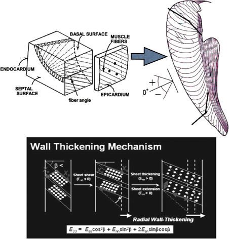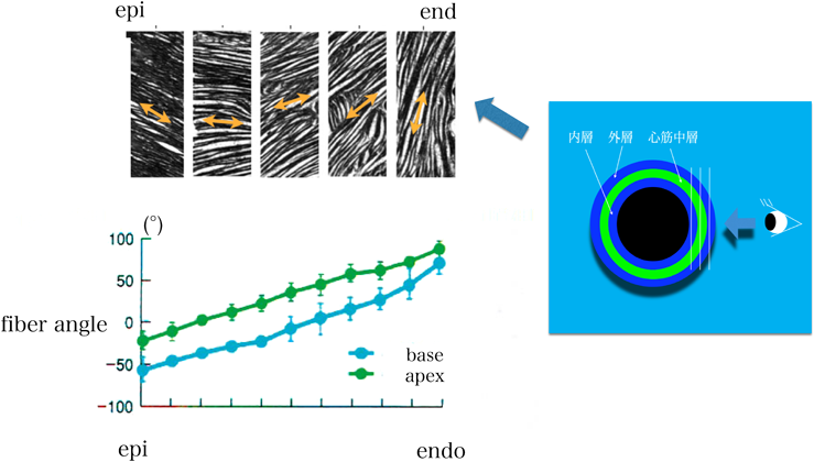 心筋線維が束となって形成する心筋シートは心外膜から心内膜方向への心筋線維と連携しており,内膜側に沿うように倒れていく.この倒れた心筋シートが収縮期に立つと内膜側を中心に大きな壁厚増加を生じることとなる.このような心筋壁内をうねるような複雑な心筋線維走行により,心筋細胞の短縮は10%ほどしかないのに,集団として効率よく働き60%以上もの左室駆出をもたらすこととなる(Fig. 5)9–11, 14).