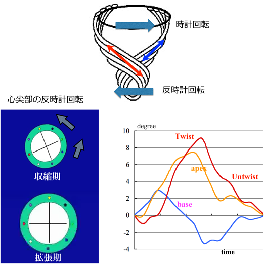 この捻れ運動は,心筋線維や心筋シートのシェアストレスを軽減して効率の良い左室駆出に重要な役割を果たしている.逆にほどけは左室の拡張初期の血液を吸い込む力であるsuckingの駆動力として働いていると考えられている.