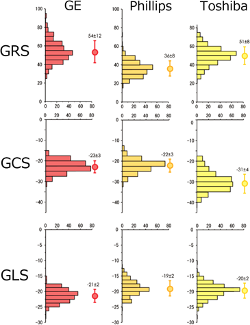 ストレインについて臨床応用が困難であった理由の一つは,年齢別や性別ごとの正常値がないことであった.さらに機種や解析装置によっても差があることが問題であった.筆者が行ったJUSTICE STUDYでは,ひとりの検者で,0~88歳の広い年齢の健康人を対象に,3社の装置を用いて多数例(各300例以上)のストレインを解析した.そのデータから正常値を出すとともに,他の検者との検者間誤差(inter-observer),検者内誤差(intra-observer),同一被検者における検査施行間の誤差(test-retest),装置間誤差(inter-vender)などを明らかにした15).それによるストレインの正常値は,GE,Phillips,Toshibaで,RSは54.6±12.6%,36.3±8.2%,51.4±8.0%,CSは−22.8±2.9%,−22.2±3.2%,−30.5±3.8%,LSは−21.3±2.1%,−18.9±2.5%,−19.9±2.4%であった(Fig. 6).このように,各社で3方向のストレイン値は有意に異なる結果となった.同一被験者を用いた各装置間の直接比較でも,ストレインの相関関係は強くなく,検査間,装置間の差が大きいことがわかった.GLSの年齢や性別変化では,Toshiba,Phillipsでは加齢によって顕著に低下し,GEでは男性で有意に低下していたが,他の機種では性別による差異はなかった.このようなストレインの特徴でも機種間に違いが存在した.解析上ではブロックマッチングの処理,内膜側への重み付け,ROIの設定法,ポストプロセッシング(プログラミング処理)の相違があるためと考えられる.しかし,もう一つの大きな問題として解析方法が各vender間で異なることが大きい.内膜トレースの時相,方法,マニュアル補正の方法(内膜側で修正するか,外膜側で修正するかなど),解析結果が正しいかの自動判定など,検者間,検査間の誤差を生む要因が数多く存在する.その他に画像収集する段階での断面の差異,設定したFRの差異なども影響するであろう.