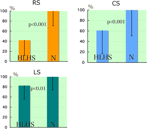 This figure shows the results of the GS analysis of the RV in patients with HLHS. The GRS and GCS were markedly decreased in patients with HLHS compared with the average GSs of the LV in normal subjects. However, only a mild reduction of GLS was observed, which may suggest that the main myofiber orientation of the RV in HLHS is longitudinal. CS: circumferential strain, GCS: global circumferential strain, GLS: global longitudinal strain, GRS: global radial strain, GS: global strain, HLHS: hypoplastic left heart syndrome, LV: left ventricle, LS: longitudinal strain, RS: radial strain, RV: right ventricle.