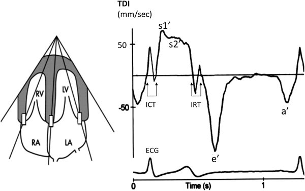 Left: A sample volume is targeted on any part of myocardium. Here, the sample volume is placed on the mitral valve annulus (its lateral or septal junctions) or on the tricuspid valve annulus. Right: Recording from the lateral junction of the mitral annulus. The Doppler spectrum shows systolic waves (s1’ and s2’), an early diastolic wave (e′), and a late diastolic wave (a′). ECG=electrocardiogram; ICT=isovolumic contraction time; IRT=isovolumic relaxation time; LA=left atrium; LV=left ventricle; RA=right atrium; RV=right ventricle; TDI=tissue Doppler imaging.
