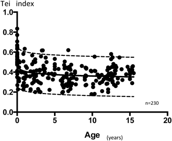The sample volume is placed on the lateral mitral valve annulus. The Tei index is significantly increased during the early neonatal period. Thereafter, the change in this index according to age is minimal. Means and 95% prediction bands are shown. r=−0.49.