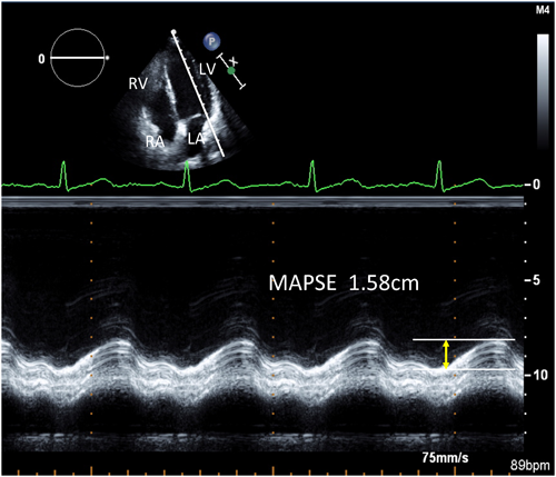 In the apical 4-chamber view, MAPSE is measured as the longitudinal mitral annular motion from the apex using M-mode echocardiography. It is measured as the distance between the peak and the bottom of the M-mode tracing curve. LA=left atrium; LV=left ventricle; RA=right atrium; RV=right ventricle; MAPSE=mitral annular plane systolic excursion.