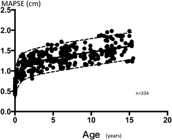 MAPSE is significantly increased with aging. MAPSE=mitral annular plane systolic excursion. Means and 95% prediction bands are shown. r=0.89.