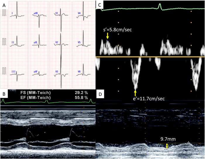 A 15-year-old boy was referred to our hospital because of ECG abnormality found during heart screening for schoolchildren. A: ECG shows ST–T change in the left precordial leads. B: Shortening fraction of the left ventricle is marginally decreased to 29%. C: Tissue Doppler imaging recorded from the lateral mitral valve annulus shows decreased velocity of systolic (s′) and early diastolic waves (e′). D: MAPSE recorded by M-mode is significantly decreased to 9.7 mm, indicating a distinct abnormality of the longitudinal systolic function of the left ventricle. MAPSE=mitral annular plane systolic excursion; ECG=electrocardiogram.