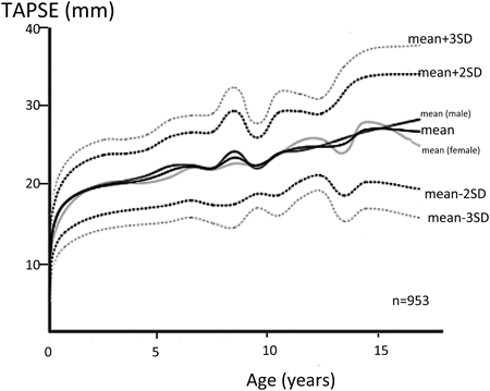 The solid line shows the mean value of TAPSE in relation to age. Sex-segregated curves are also shown. The dotted lines represent ±2 SD and ±3 SD, respectively. TAPSE=tricuspid annular plane systolic excursion. Revised with permission by Dr. Hashimoto (Ref. 17).