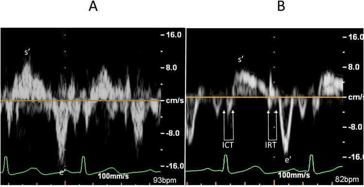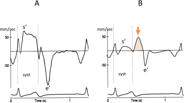 A: TDI recording on the lateral mitral valve annulus from the 4-chamber view in a normal subject. B: In ischemic or fibrotic myocardium, s′ is reduced and followed by a deformation after systole, the so-called post-systolic shortening (PSS: shown by arrow). PSS is explained in part by passive recoil, which releases energy stored in the scar tissue during systolic intraventricular unloading. TDI=tissue Doppler imaging; syst=systolic period; s′=systolic wall motion velocity; e′=early diastolic wall motion velocity.