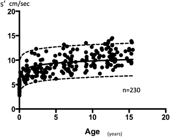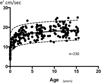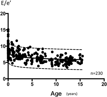 The sample volume is placed on the lateral mitral valve annulus. The E/e′ ratio is significantly increased during the neonatal period. Thereafter, this index slowly decreases with aging. E=mitral flow velocity during early diastole; e′=early diastolic wall motion velocity of the mitral valve annulus. Means and 95% prediction bands are shown. r=−0.62.
