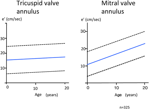 Left panel: Early diastolic wall motion velocity (e′) of the tricuspid valve annulus shows a marginal increase according to age. r=0.13. Right panel: Early diastolic wall motion velocity (e′) of the mitral valve annulus significantly increases according to age. r=0.70. Means and 95% prediction bands are shown. Arranged from reference 7 .