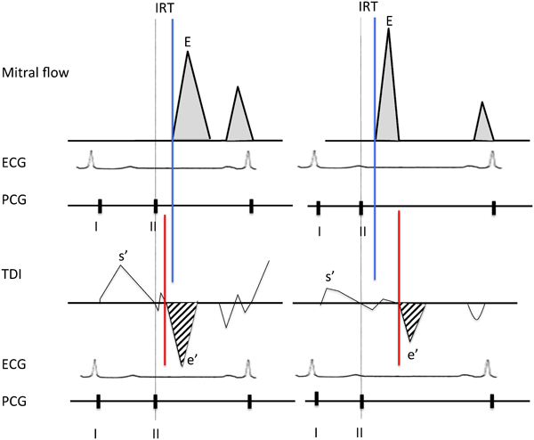 Left: In a normal subject, the onset of the e′ wave (red line) is at the time same as or a little earlier than that of the E wave (blue line). Right: In a subject with significantly increased left ventricular filling pressure, the delay of the onset of the e′ wave is recognized, compared with the onset of the E wave. The dotted line shows the second heart sound. E=mitral flow velocity during early diastole; e′=early diastolic wall motion velocity of the mitral valve annulus; ECG=electrocardiogram; IRT=isovolumic relaxation time; PCG=phonocardiogram; TDI=tissue Doppler imaging.