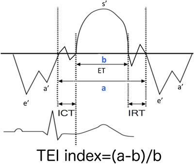The Tei index is calculated as (a–b)/b, where a is the interval between cessation of the a′ wave and onset of the subsequent e′ wave, and b is the interval of the s′ wave. ET=ejection time; ICT=isovolumic contraction time; IRT=isovolumic relaxation time; a′=late diastolic wall motion velocity; e′=early diastolic wall motion velocity; s′=systolic wall motion velocity.