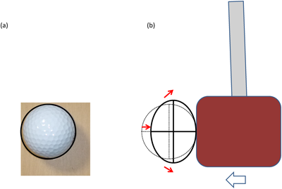 (a) The golf ball stationary. (b) The change of the shape upon hitting. Shortening occurs horizontally (negative strain) but lengthening is evident in the perpendicular direction (positive strain).