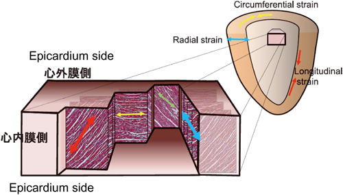 左室心筋は3層構造であることが知られ5),心内膜側,心外膜側,その間の心筋中層の3層からなり,3層で心筋線維の走行の方向が異なる(Fig. 2).図のように,心筋線維は,心内膜下であれば長軸方向が,中層では円周方向が主である.すべての方向で低下していれば全周性の障害を疑うが,長軸方向のみの低下であれば心内膜下の,円周方向のみの低下であれば中層に特化した障害を疑う6).