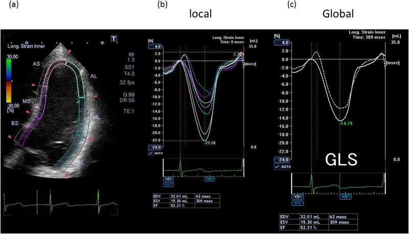(a) Trace of the myocardium in the apical 4-chamber view; (b) local and (c) global longitudinal strains (GLS) in the patient after an arterial switch operation for transposition of the great arteries.