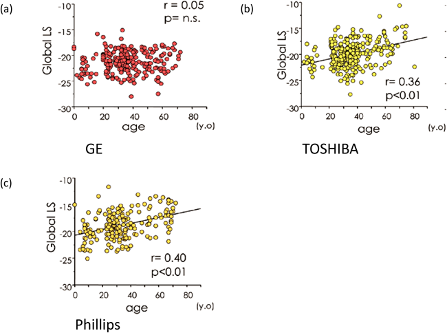 日本で施行された大規模多施設共同研究であるJUSTICE研究は,メーカー3社によるSpeckle tracking法のストレイン測定値を検討し,各メーカーの算出する3方向のストレイン値は異なり,互換性がないことを明らかにした12).例えばFig. 5に示す通り,GLSは,GEでは年齢依存性を認めないが,TOSHIBA,Phillipsでは年齢とともにGLSの大きさが有意に減少した.ブラックボックスの中にある画像処理や演算過程に,決定的なメーカーごとの差異があることが考えられる.したがって現状での対処としては,検査レポートに測定エコーメーカー,機器名,解析ソフトウエアの明示が必要であり,同一患者のフォローで経時変化を検討するには,同一機種,同一解析ソフトウエア,同一断面で計測することが求められる.同一解析ソフトウエアでも,Versionが異なるとstrain等の結果が異なる場合があり,注意を要する.二点間距離の変化率というストレインの定義は簡明だが,心筋壁および心筋全体にどのように当てはめてグローバル・ストレインを算出しているかが不明で,かつ大きく異なっているのが現状と思われる.Speckle tracking法によるストレインを臨床で活かすために,メーカーを超えて測定値に互換性がでること,結局のところグローバル・ストレインは実際どのように算出され,したがってその生理的意義は何かがより明らかにされることが,今後期待される.