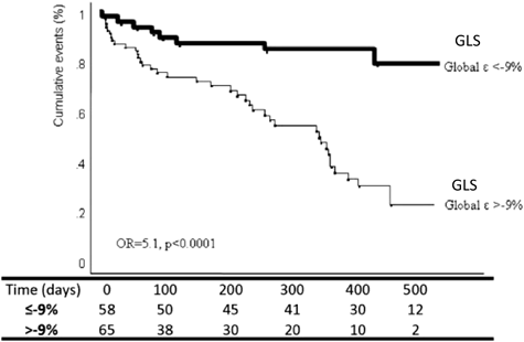 それではGLSと駆出率などの従来指標で,いずれが予後を良好に予測するだろうか.成人慢性心不全患者(駆出率31±10%)における,心血管死,心移植(または補助人工心臓植え込み),心不全再入院をエンドポイントとした前向き研究でGLS不良例ではイベント発生率が高く(Fig. 7),心不全患者の予後予測は,GLSが,駆出率,ストレイン・レート,組織ドプラより優れていた8, 9).その後もGLSは,予後予測において駆出率に勝る状況が報告されてきている10, 11)ことから,今後駆出率とともに,レポートすべき収縮性の基本項目になっていくかもしれない.