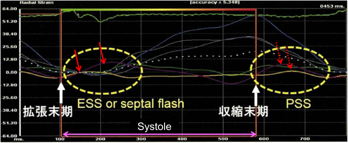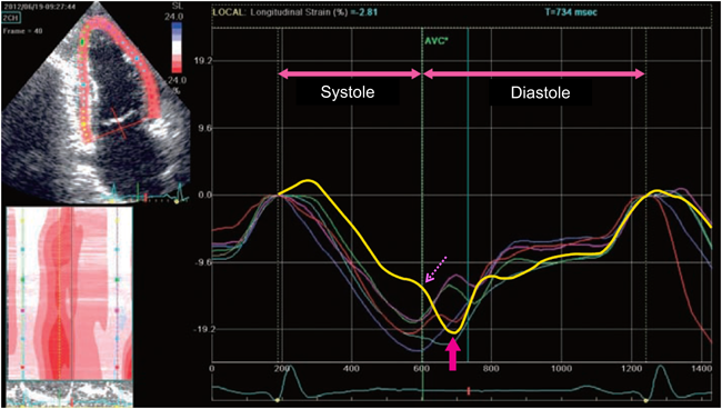 Septal flash(Fig. 8)4)は心室内圧が十分に上昇していない等容収縮期に,心室中隔が先んじて収縮し,内外にペコペコと震えるような異常な動きであり,CRT有効例を予測する同期不全の重要な所見である2).PSSは,収縮期終了後の収縮(Fig. 9)16)で,ほかの部位のピークが収縮期であるのに比して,収縮期を超えて遅れて収縮するものを言う.正常例でも認めることがあるため,PSSの存在が即異常ではないが,成人ではFig. 9のように大動脈弁閉鎖点のストレインが低下し(細矢印),大動脈弁閉鎖後90 ms以上持続するPSSがあれば病的な可能性が高い16)とされる.このようにSpeckle tracking法は見た目では捉えがたい,あるいは異常と認識できても報告しにくい心筋壁運動の異常を,時間軸に対する部位毎の運動変化の異常として可視化できる.