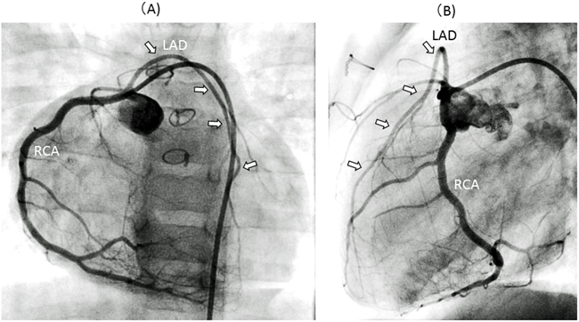 (A): Selective right coronary arterial angiogram from the anteroposterior view: LAD (arrows) originates from the RCA.(B): Lateral view of the same selective right coronary arterial angiogram: LAD (arrows) runs on the anterosuperior side of the right ventricular outflow tract.LAD: left anterior descending artery; RCA: right coronary artery.