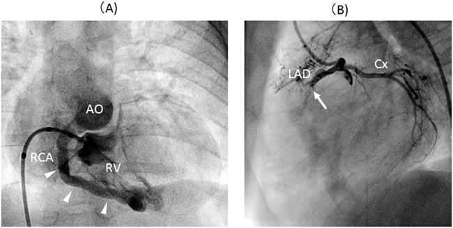 (A): Large sinusoidal communication between the right ventricular apex and right coronary artery (arrowhead).(B): Interruption of the left anterior descending artery (arrow).AO: aorta; Cx: left circumflex artery; LAD: left anterior descending artery; RCA: right coronary artery; RV: right ventricle.