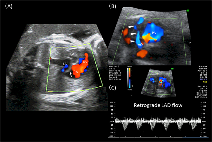 (A): Early premature closure of the foramen ovale. Note the increased thickness of the atrial septum (arrow) and enlarged left atrium.(B): Retrograde flow (arrowhead) in the left anterior descending artery.(C): Retrograde flow in the left anterior descending artery confirmed by pulsed Doppler.AO: aorta; LA: left atrium; LAD: left anterior descending; LV: left ventricle; RA: right atrium; RV: right ventricle; PA: pulmonary artery.