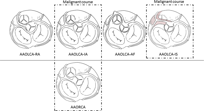 AAOLCA: anomalous aortic origin of left coronary artery; AAORCA: anomalous aortic origin of right coronary artery; AF: anterior free wall course; IA: interarterial course; IS: intraseptal course; RA: retroaortic course.