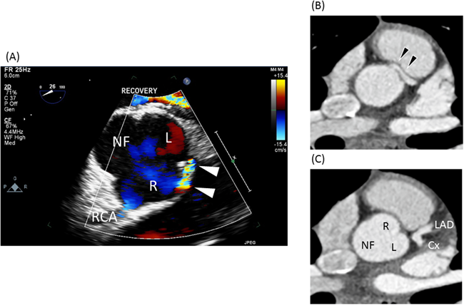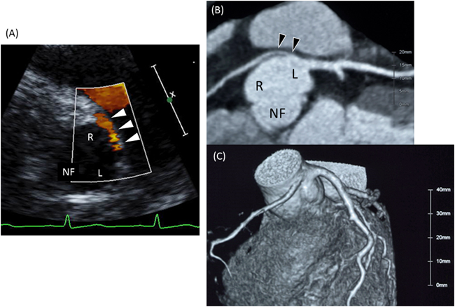 (A): Trans-thoracic echo: right coronary artery arises from left aortic sinus and runs the intramural course. Note the red-colored Doppler flow in the intramural course (white arrowheads).(B): Enhanced CT: right coronary artery arises from the left aortic sinus at an acute angle and courses intramurally and interarterially (black arrowheads).(C): Three-dimensional CT.L: left aortic sinus; NF: non-facing sinus; R: right aortic sinus.
