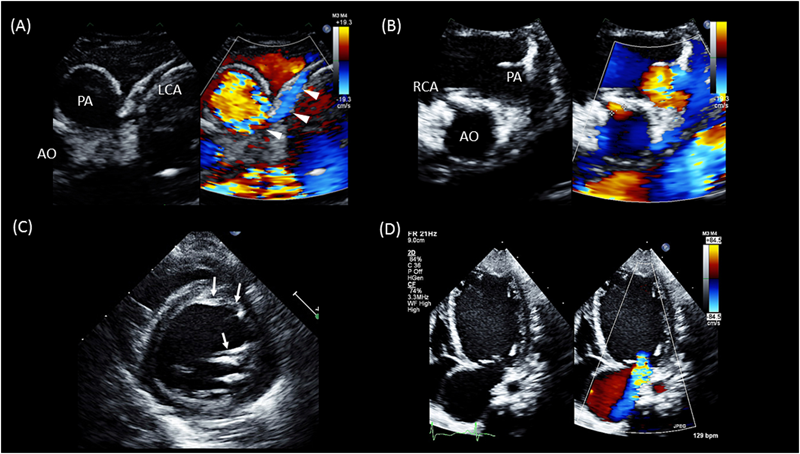 (A): Left coronary artery: Note the retrograde flow in the left coronary artery (white arrowheads) that drains into the posterior aspect of the pulmonary artery.(B): Right coronary artery at the normal position of the right aortic sinus with antegrade flow.(C): Short axis view of the left ventricle: Note the increased brightness of the endocardium of the anteroseptum and anterolateral papillary muscle (arrow).(D): Apical chamber view displays moderate mitral regurgitation.AO: aorta; LCA: left coronary artery; PA: pulmonary artery; RCA: right coronary artery.
