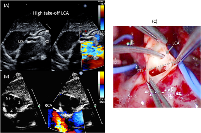 B) 冠動脈高位起始(high take-off/high ostium)冠動脈起始部がsinotubular junction(STJ)よりも頭側にある場合を指す.小児において明確な定義はないが,成人領域ではSTJよりも1 cm以上離れて起始する場合と定義されている2, 42).血行動態的な意義は乏しいが,選択的冠動脈造影の際にカテーテル挿入が困難になることや,開心術における大動脈切離の際に誤って損傷する恐れがあることなどの点で注意が必要である.
