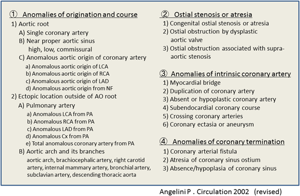 46) Angelini P, Flamm SD: Newer concepts for imaging anomalous aortic origin of the coronary arteries in adults. Catheter Cardiovasc Interv 2007; 69: 942–954