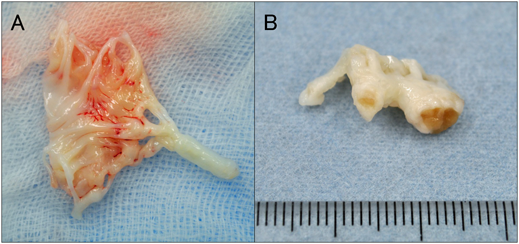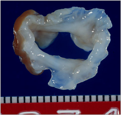 一方,先天性僧帽弁閉鎖不全症においても,早期発症例では,弁尖の強い異型性,肥厚がしばしばみられる(Fig. 3).肥厚した腱索の弁葉左室面への付着,一側乳頭筋の過形成や低形成を伴うこともある.僧帽弁閉鎖不全の場合には二次的な弁輪拡大を伴うことが多いが,縫縮術を行う場合には成長を考慮する必要があり,成人のようなrigid ringを用いた術式は選択肢とはならない.