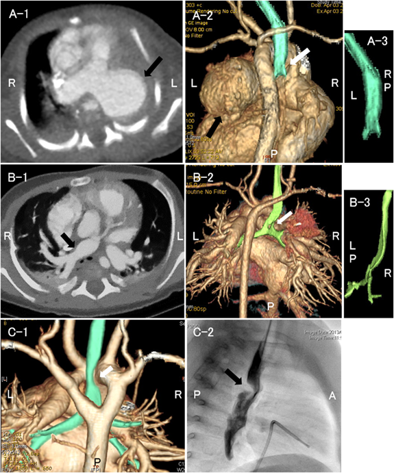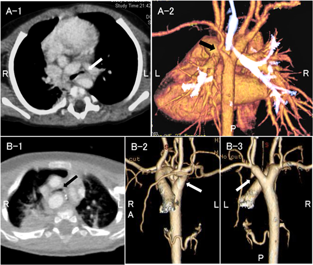 症例4以外の全例に造影CTを行い,心血管構造による気管気管支の圧排,扁平化を認めたため,外的圧迫による二次性気管気管支軟化症と診断した.先天性気管狭窄の症例はなかった.各群の代表的な画像をFig. 1に例示した.I群は主に拡大した肺動脈,II群は拡大した肺動脈や左房,III群は血管輪を形成する大動脈弓や動脈管索等で気管気管支を圧排されていた.症例14は右大動脈弓,Kommerell憩室を伴う左鎖骨下動脈起始異常で血管輪を形成し,左主気管支が主に圧排されていた(Fig. 2A).症例15は右大動脈弓,Kommerell憩室を伴う左腕頭動脈起始異常で非常に稀な血管奇形であった8).造影CTおよび心臓手術の術中所見で左総頸動脈・左鎖骨下動脈と上行大動脈との連続性がなかったことから確定診断した(Fig. 2B).