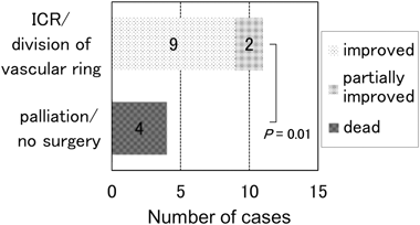 手術月齢は,I群2.8±3.0,II群6.0±3.4,III群7.8±3.9(平均±標準偏差)であり,初発症状出現から初回手術までの平均待機月数は,I群2.2±2.2,II群2.0±1.8,III群4.0±1.6(平均±標準偏差)であった.術前に死亡した症例はその時点までに外科的介入が必要であったと考え,死亡月齢を手術月齢として計算した.症例ごとに経過のばらつきが大きく,Mann–Whitney U-testを用いた群間比較では,明らかな統計学的有意差は得られなかった.ICRまたは血管輪解除による気道圧迫解除を行った11例中9例(82%)で気道症状が改善した.一方,死亡した4例は全例ICRが施行されていなかった(Fig. 3).気道症状残存の2例は心臓手術前あるいは同時に気管切開を行った.外科手術による気道症状の予後について,Fisher’s exact probability testを用いて検定を行った結果,ICR未施行は有意に予後不良であった(p=0.01).