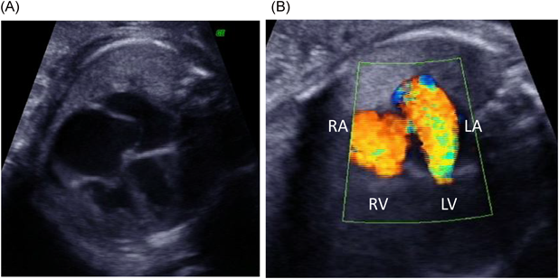 胎児心臓超音波検査ではCTAR47%,心横径ϕ35.6 mm,心拍数148 bpm,四腔は著明に拡大,右室壁の肥大を認め,僧帽弁輪径11.2 mm, MR重度,三尖弁輪径10.4 mm, TR重度,左室駆出率(Left ventricular ejection fraction; LVEF)50%であった(Fig. 1).肺動脈弁の狭窄はなく,動脈管,卵円孔の閉鎖は認めなかった.また,供血児はCTAR29%,心横径28.0 mmと週数相当であり房室弁逆流を認めなかった.在胎週数が早く,FLP後のため房室弁逆流が改善する可能性に期待し経過観察とした.分娩時期に関しては,供血児に異常がないため供血児を優先して判断する方針とした.経過中,胎児のnon-stress test(NST)では両児ともにreassuring patternで,臍帯血流の途絶が見られず観察を続けることができた.出生前の弁輪径とCTARの推移は在胎28週1日,僧帽弁輪径12.4 mm,三尖弁輪径14.1 mm.在胎29週5日,僧帽弁輪径12.9 mm,三尖弁輪径13.3 mmで在胎32週1日,僧帽弁輪径12.3 mm,三尖弁輪径13.6 mm, CTAR47%であり,重度のMR, TRは持続した.在胎32週4日,前期破水のため帝王切開とした.