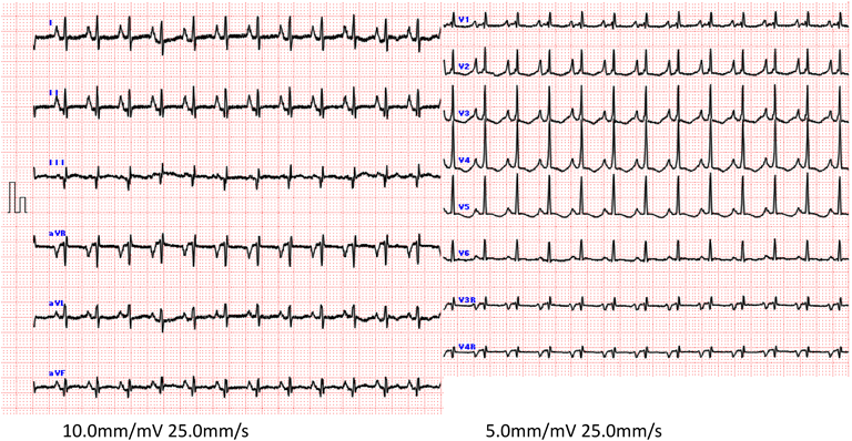 心電図:心拍数152/分,軸35度,両心房負荷,両心室肥大(Fig. 3)