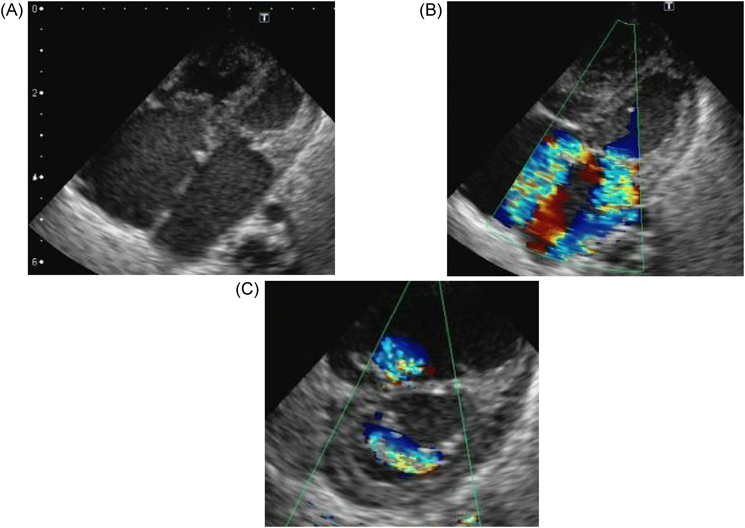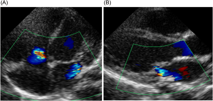 心臓超音波検査:僧帽弁輪径10.8 mm,僧帽弁に肥厚(A1–A3, P2)と前尖(A2)に軽度の逸脱あり,MR重度でA1からA3まで幅広く認め左心房後壁へ向かう,乳頭筋は2つ認め腱索に断裂なし,左室流入血流E/A=0.86/1.0 m/s,三尖弁輪径12.7 mm, TR重度で接合不全を認め中央部から後方かつ中隔側へ向かう(Fig. 4),推定右室圧66.0 mmHg, LVEF 57.8%,左室拡張末期径(left ventricular end-diastolic dimension; LVDd)16.5 mm,左室壁厚2.9 mm,動脈管径1.5 mmで左右短絡,冠動脈起始異常なし.