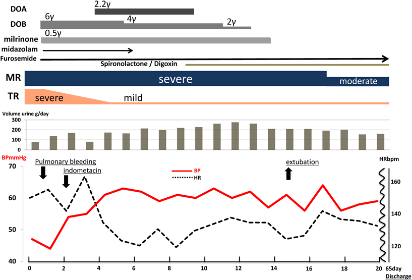 日齢4:MR重度と不変も左房径15.9×18.8 mmと縮小,僧帽弁輪径10.8 mm,三尖弁輪径12.8 mm, LVDd 20.3 mm,推定右室圧22.8 mmHg,TR軽度と軽快した.フロセミドの静注では尿量が乏しく,腎血流量増加目的でドパミンの点滴を開始し,以後尿量は増加し安定した.