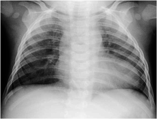 マイクロバブルテストはweakで,新生児呼吸窮迫症候群(respiratory distress syndrome; RDS)と診断しサーファクタントを2バイアル気管内投与した.水分制限,人工換気,酸素吸入,ドブタミン,ミルリノンで治療を開始した(Fig. 5).