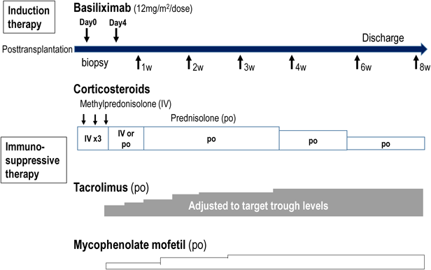 One of the contemporary immunosuppression regimens in pediatric heart transplantation. The figure shows a brief outline of tacrolimus-based triple immunosuppressive therapy combined with induction.