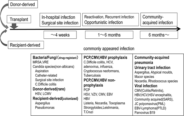 移植後感染症として,院内感染,家族内感染,日和見感染に加えて,レシピエント由来やドナー由来の感染症にも注意が必要である.移植前および移植後も定期的にウイルス抗体価をチェックしておく.輸血が必要なときには,放射線照射および白血球除去フィルターを用い(日本では日本赤十字社で処理済),可能であれば抗CMV抗体陰性の輸血を行う.
