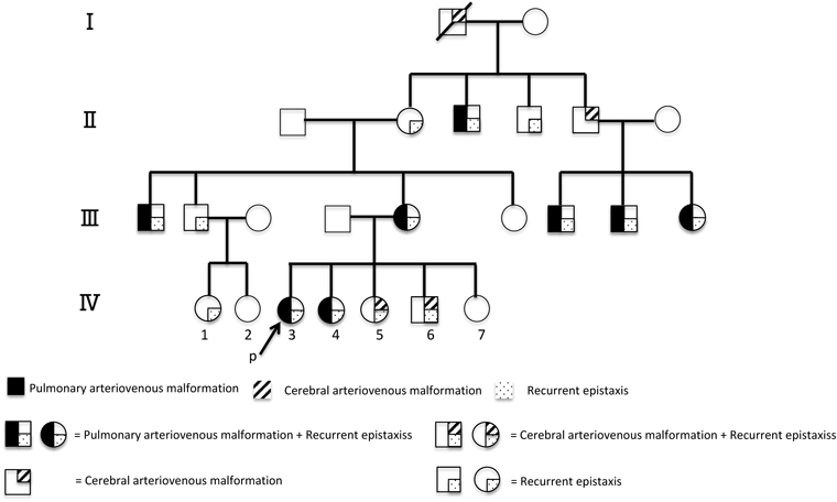 本児の同胞を含め,母方4世代の血縁者16名に鼻出血や肺・脳動静脈奇形の家族歴を認めた.姉がENG遺伝子変異まで同定され本家系において初めてHHTの診断となっている.