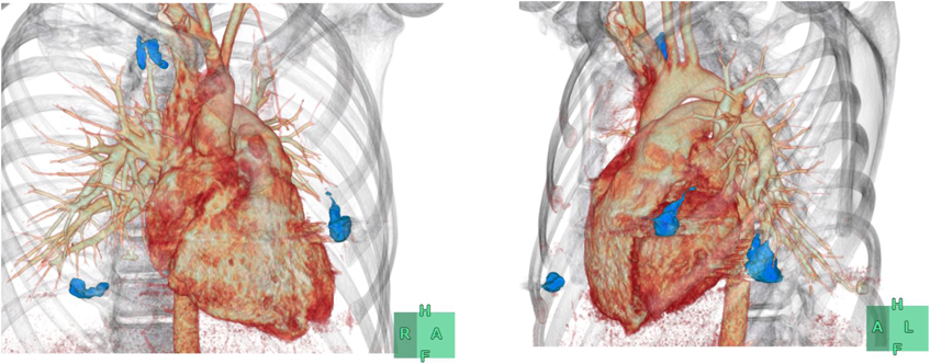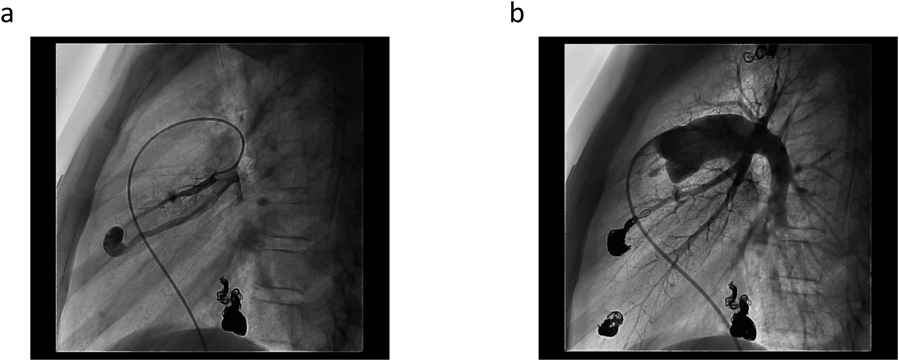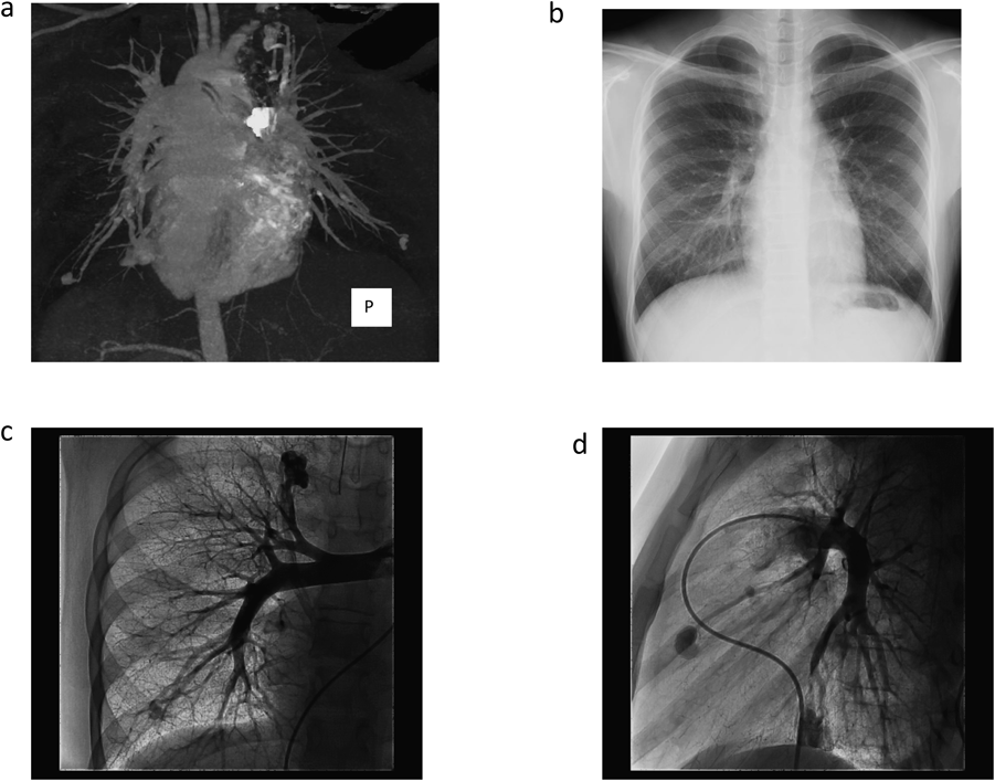 姉が頭痛,低酸素血症を契機に当院を受診し臨床所見,遺伝子検査にてHHT type 1と診断された.鼻出血や血管奇形の濃厚な家族歴が認められていたことから同胞のスクリーニング検査のため当院を受診した.家族歴,粘膜(舌)・頬部の毛細血管拡張,繰り返す鼻出血よりHHTと診断した.SpO2 93%と低酸素血症を認めたため短絡量のあるPAVMを疑い経胸壁コントラスト心エコー(Transthoracic contrast echocardiography: TTCE)ではなく造影CT(Fig. 2a)を施行し多発性PAVMの診断に至った.PAVMはいずれも1本の流入肺動脈と流出肺静脈が吻合する単純型で流入動脈径3 mm未満であったが瘻までのアクセスが可能と判断されたためコイル塞栓術(coil embolization: CE)を計画し加療目的にて入院となった.