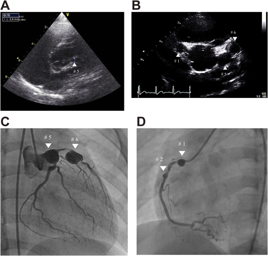 (A) Echocardiogram performed in Case 1 during the acute phase of Kawasaki disease at a local hospital. Retrospectively, only the proximal part of the left coronary artery could be visualized (white ▲). (B) Echocardiogram in Case 1 performed at school cardiac screening. The parasternal short axis of the aortic root demonstrated the presence of bilateral coronary artery aneurysms (white ▲). The diameter of the right coronary artery aneurysm was 7.4 mm at #1 and those of left coronary artery aneurysms were 9.1 at #5 and 9.5 mm at #6, respectively. (C) Left coronary angiography in Case 1 demonstrating coronary artery aneurysms of 10.7 mm and 12.3 mm in diameter at segment 5 and segment 6 (white ▼), with a 99% stenosis between the aneurysms. (D) Right coronary angiography in Case 1 demonstrating coronary artery aneurysms of 6.6 mm and 3.1 mm in diameter at segment 1 and segment 2 (white ▼).
